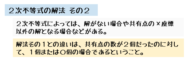 2次不等式の解法では、グラフとx軸との共有点の個数がポイント