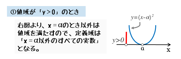 値域がy>0のとき、値域に対応するグラフは、y座標が0である共有点を除いた部分になります。