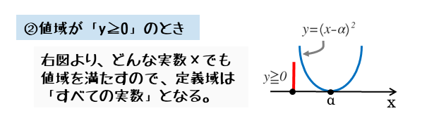 さて、グラフとx軸との位置関係や共有点のx座標が分かったので、値域に対応する定義域を考えてみましょう。