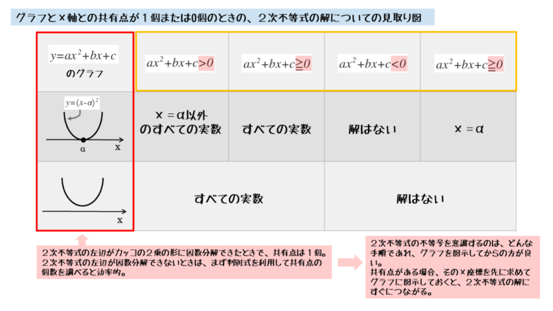 グラフとx軸との共有点が1個または0個のとき、2次不等式の解がどうなるかを一覧表にまとめると以下のようになります。