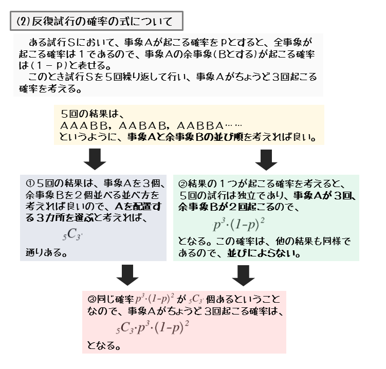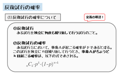 これを一般化したものが先ほどの反復試行の確率の式になります。ただの暗記で済まさず、導出の課程を理解することが大切です。