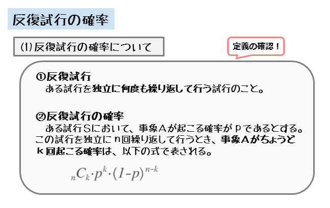 反復試行の確率を求めるには、独立な試行の確率に関する知識を必要とします。不安な人は、独立な試行の確率の単元を確認しながら学習すると良いでしょう。