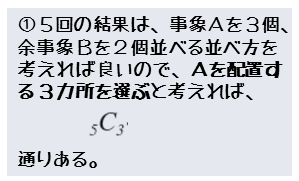 並べ方を考えるので、3個のAと2個のBを一列に並べる順列を考えれば良いことが分かります。ただし、同じものを含む順列になるので、このようなときには組合せの考え方を利用します。
