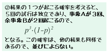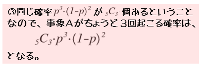 たとえば、ある試行Sにおいて、事象Aが起こる確率をpとします。試行Sを5回行ったとき、事象Aがちょうど3回起こる確率を求めてみましょう。