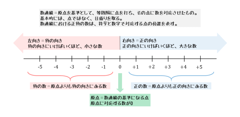 - 数直線では、正負の符号は原点を基準とした向きを表す。
