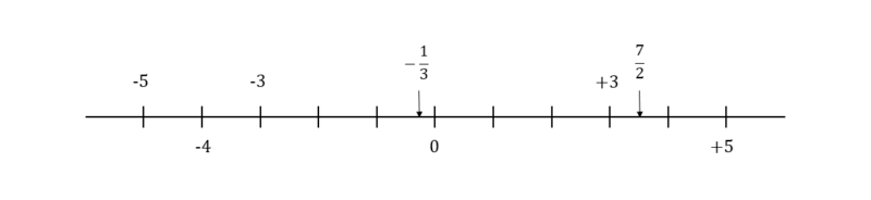 \begin{align} -5 \ , \ -3 \ , \ -\frac{1}{3} \ , \ 3 \ , \ \frac{7}{2} \end{align}数の大小関係は「符号で向き、数字で絶対値を読み取り、数を数直線に割り振る」の手順で求める。