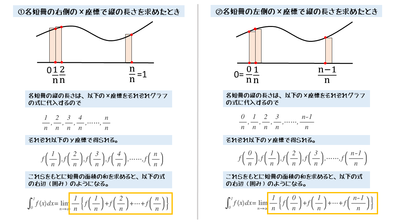 - 「k/n」をxに置き換えたものが、定積分で使う関数f(x)の式。