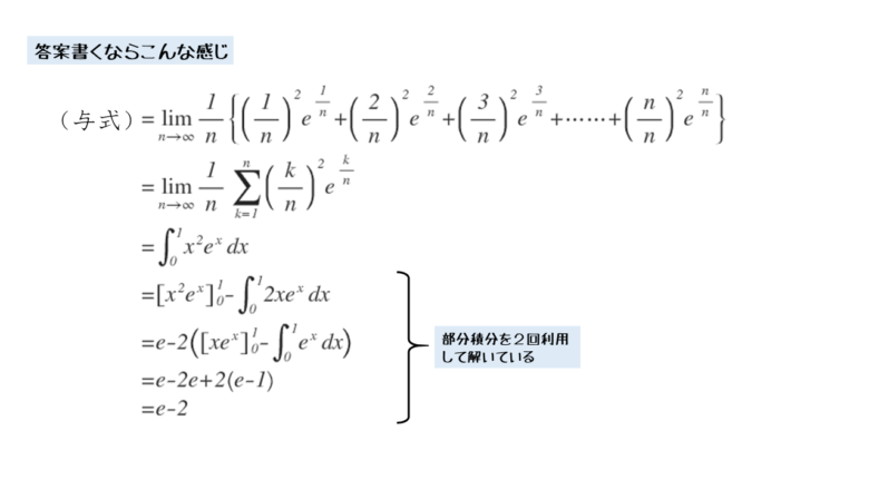 そういう点では、本問は区分求積法を扱った基本問題になります。類題をたくさん解いて、式変形のコツをぜひ掴んで下さい。