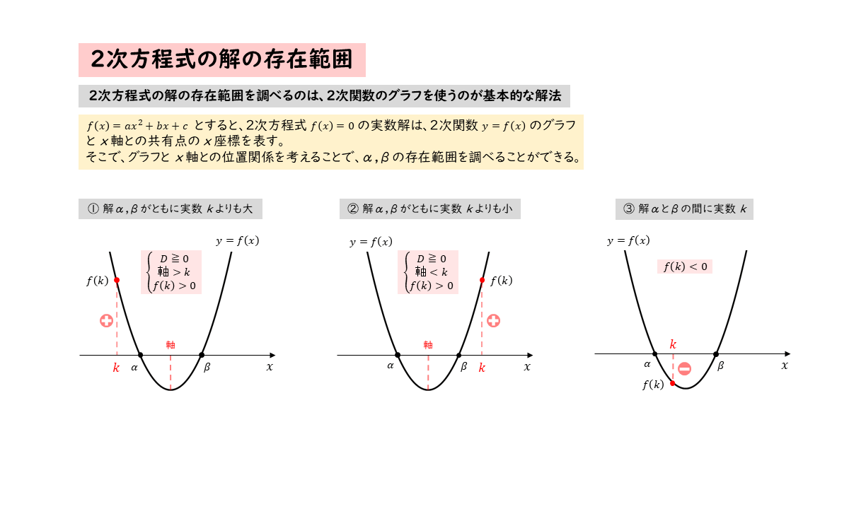 放物線と2次方程式にはこのような対応関係があるので、放物線とx軸の位置関係を考えれば、実数解α,βが存在する範囲を調べることができます。このことは、実数解の符号でも同じ要領で調べています。