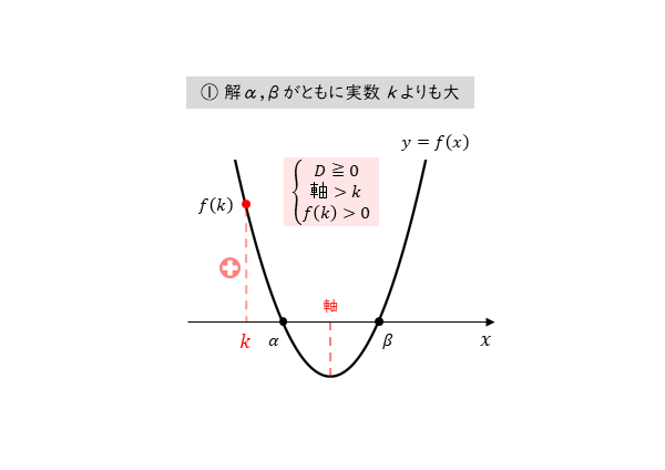 - 2つの実数解α,βがともに実数kより大きい