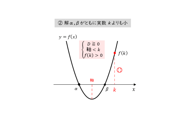 - 2つの実数解α,βがともに実数kより小さい