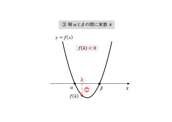 - 2つの実数解α,βの間に実数kがある