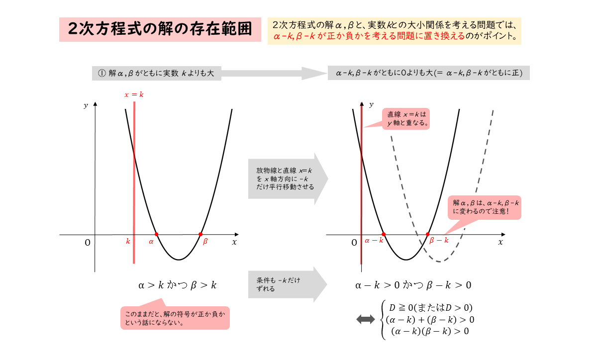 たとえば、2つの実数解α,βがともに実数kより大きい場合、共有点が直線x=kよりも右側にあります。この直線x=kは、x軸方向に-kだけ平行移動させると、y軸に重なります。