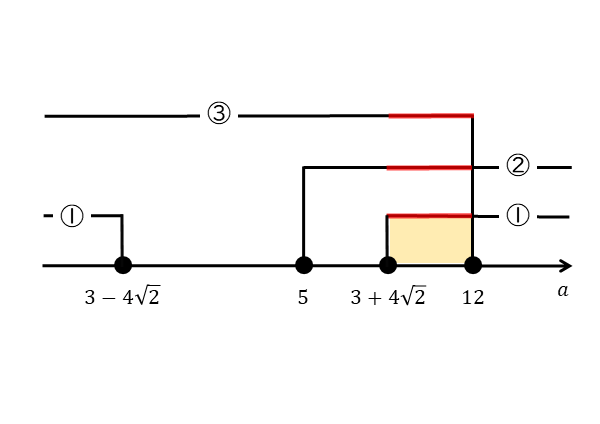 &\quad a \leqq 3-4 \sqrt{2} \ , \ 3+4 \sqrt{2} \geqq a \quad \cdots \text{①} \\[ 7pt ]