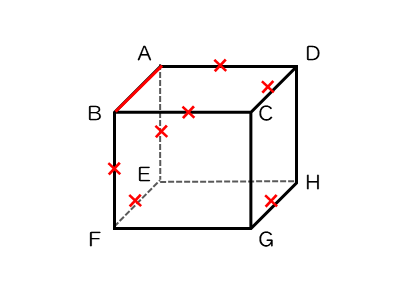辺ABは平面ABGHに含まれる辺で、立方体の一辺です。この辺ABと垂直な辺はBF,BC,AE,ADの4つあります。