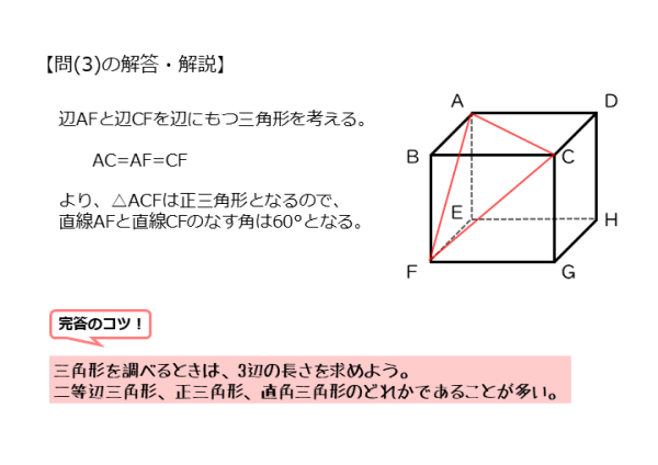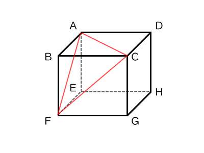 △ACFの3辺は、すべて立方体の面の対角線になっています。ですから、△ACFはAC=CF=FAの正三角形であることが分かります。