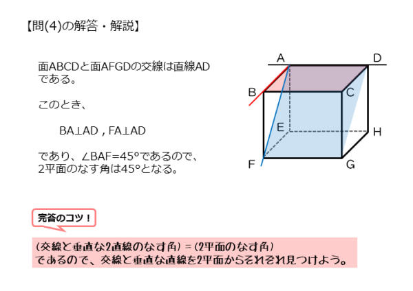 問(4)は、2平面のなす角を求める問題です。2平面の交線を探します。2平面の交線は直線ADになります。
