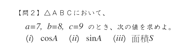 問2(i)は、∠Aに対する余弦cosAを求める問題です。3辺の長さが与えられているので、余弦定理を利用します。