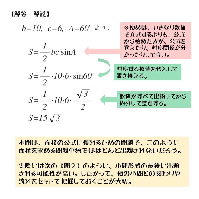 \begin{align*} \quad S &= \frac{1}{2} \cdot AC \cdot AB \sin A \\[ 7pt ] &= \frac{1}{2} \cdot 10 \cdot 6 \cdot \sin {60^{\circ}} \\[ 7pt ] &= \frac{1}{2} \cdot 10 \cdot 6 \cdot \frac{\sqrt{3}}{2} \\[ 7pt ] &= 15\sqrt{3} \end{align*}問1のポイントと解答例をまとめると以下のようになります。