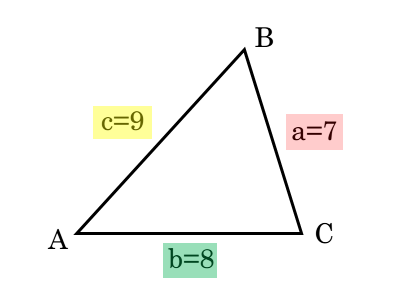 $\triangle ABC$ において、$a=7 \ , \ b=8 \ , \ c=9$ のとき、次の値を求めよ。