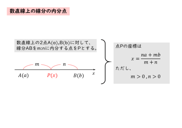 &\text{数直線上の $2$ 点 $A(a),B(b)$ に対して、線分 $AB$ を} \\[ 5pt ]