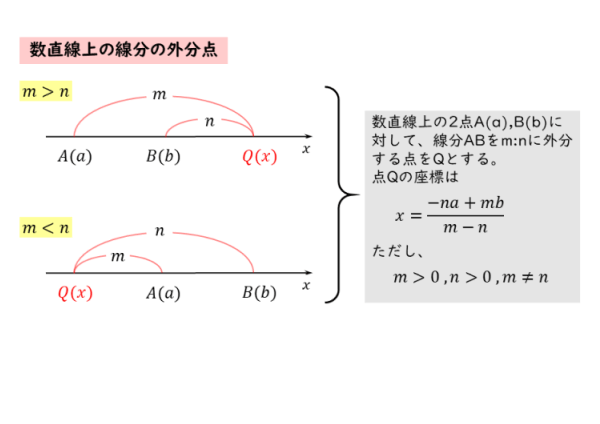 どちらも場合であっても、上述した公式で外分点の座標を求めることができますが、外分比に注意しましょう。