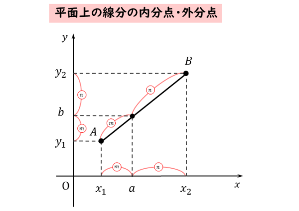平面上の線分の内分点や外分点を考えます。これらの座標を求めるには、x座標とy座標を別々に求めます。