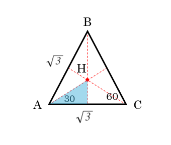 △ABCは正三角形なので内角はすべて60°であり、また3辺の長さも初めから分かっています。2辺とそのはさむ角の大きさが分かっているので、三角形の面積の公式を使って△ABCの面積を求めます。