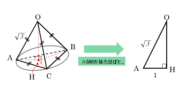 直角三角形では三平方の定理が成り立つので、それを利用して垂線OHの長さ、すなわち正四面体の高さを求めます。