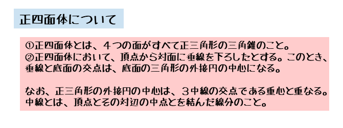 ①正四面体とは、4つの面がすべて正三角形の三角錐のこと。