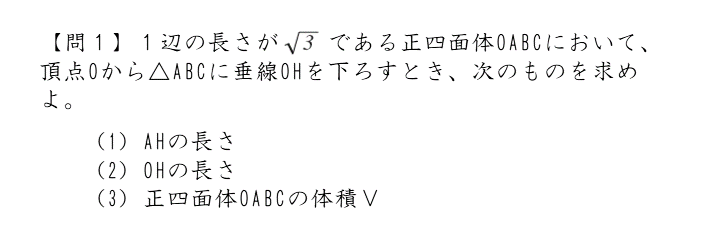 設問全体に目を通すと、最後の問1(3)で正四面体の体積を求めますが、それまでの問題をきちんと解いていけば必、要な数量が揃っているはずです。計算ミスのないように注意しましょう。