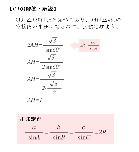 \begin{align*} \quad 2R &= \frac{BC}{\sin {\angle BAC}} \\[ 7pt ] 2 \cdot AH &= \frac{\sqrt{3}}{\sin 60^{\circ}} \\[ 7pt ] AH &= \frac{\sqrt{3}}{2 \cdot \sin 60^{\circ}} \end{align*}式に数を代入した後はミスのないように計算します。解答例の続きは以下のようになります。