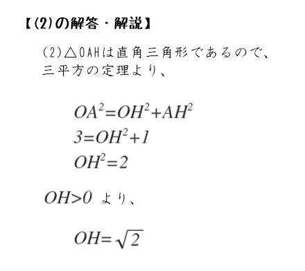 \begin{align*} &\quad {OH}^{2} + {AH}^{2} = {OA}^{2} \\[ 7pt ] &\quad {OH}^{2} = {OA}^{2} – {AH}^{2} \end{align*}あとはこれを解くだけです。解答例の続きは以下のようになります。