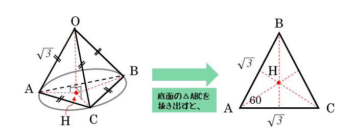 $1$ 辺の長さが $\sqrt{3}$ である正四面体 $OABC$ において、頂点 $O$ から $\triangle ABC$ に垂線 $OH$ を下ろすとき、次のものを求めなさい。