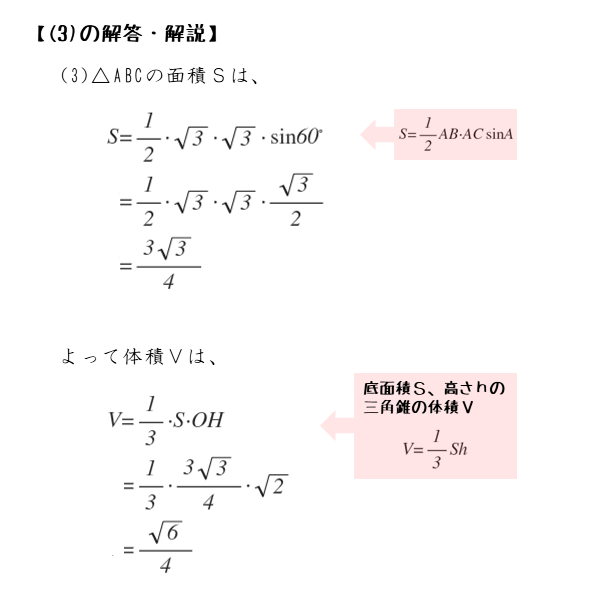 \begin{align*} \quad V = \frac{1}{3} \cdot \triangle ABC \cdot OH \end{align*}これまでに求めた値を代入して体積を求めます。解答例の続きは以下のようになります。