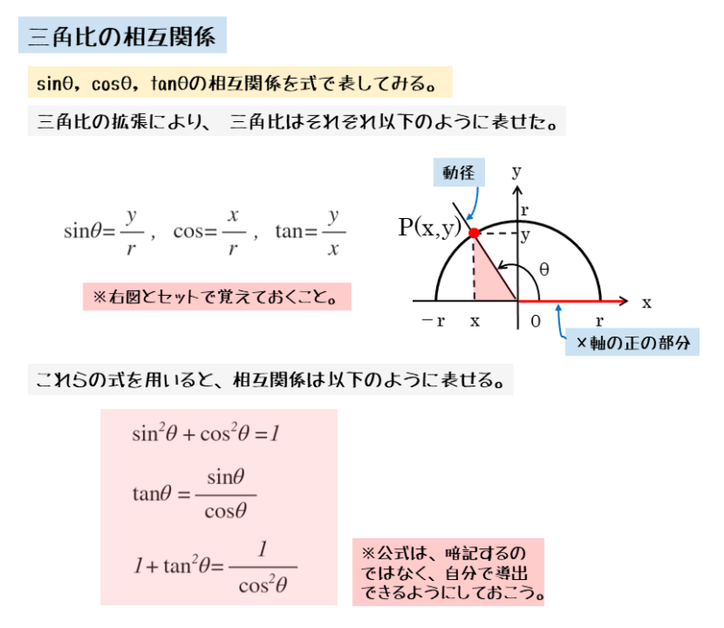 三角比の相互関係は、正弦・余弦・正接の関係を表します。この関係は、三角比の拡張で学習したことを利用して導出されます。