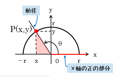 半径 $r$ の円周上に点 $P \ (x \ , \ y)$ があるとき