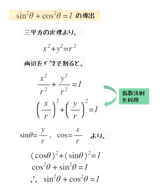 \begin{align*} \quad \left(\cos \theta \right)^{2} + \left(\sin \theta \right)^{2} &=1 \\[ 7pt ] \quad \cos^{2}{\theta} + \sin^{2}{\theta} &=1 \\[ 7pt ] \therefore \ \sin^{2}{\theta} +\cos^{2}{\theta} &=1 \end{align*}正弦と余弦の相互関係を導出するために、三平方の定理、等式の性質、指数法則を利用しています。