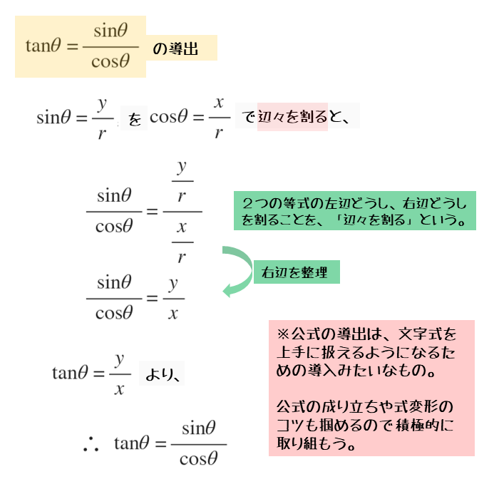 \begin{align*} \quad \tan \theta &= \frac{r \sin \theta}{r \cos \theta} \\[ 7pt ] \therefore \ \tan \theta &= \frac{\sin \theta}{\cos \theta} \end{align*}別の導出例は以下のようになります。「辺々割る」という耳慣れない用語がありますが、左辺どうし、右辺どうしを割るという意味です。