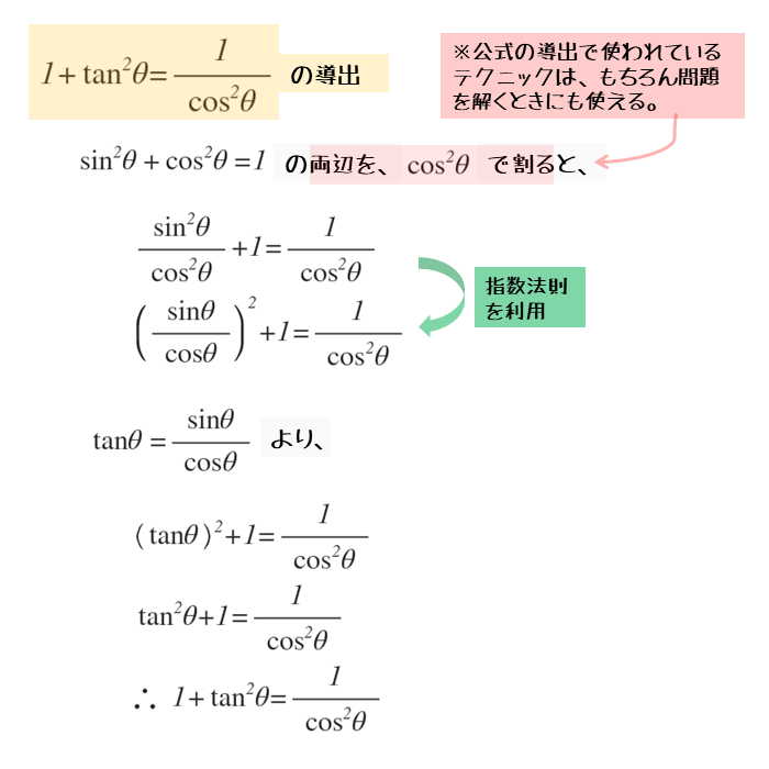 \begin{align*} \quad \left( \tan \theta \right)^{2} + 1 &= \frac{1}{\cos^{2}{\theta}} \\[ 7pt ] \quad \tan^{2}{\theta} + 1 &= \frac{1}{\cos^{2}{\theta}} \\[ 7pt ] \quad \therefore \ 1 + \tan^{2}{\theta} &=\frac{1}{\cos^{2}{\theta}} \end{align*}指数法則を上手に利用して変形しています。また、累乗の表し方にも注意が必要です。