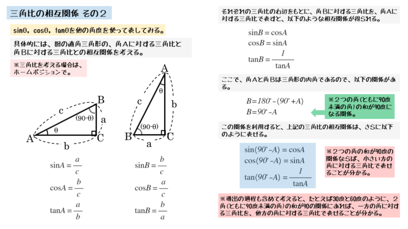 今回の相互関係は2つの角に対する三角比の相互関係です。