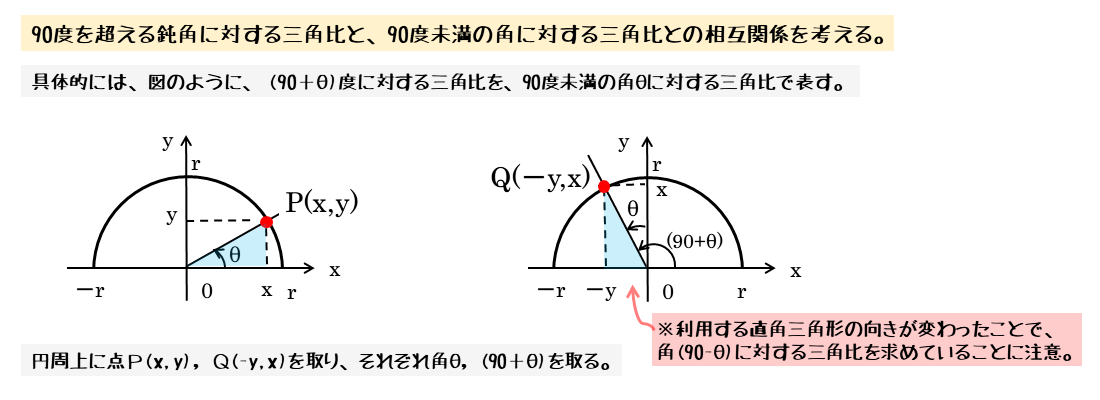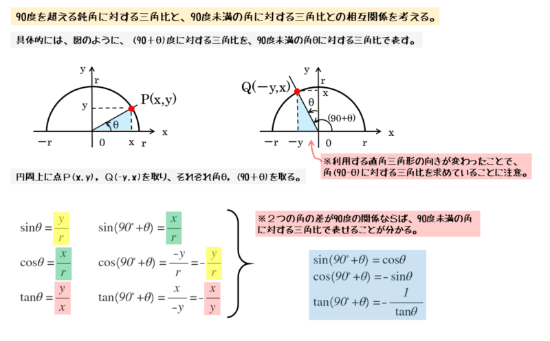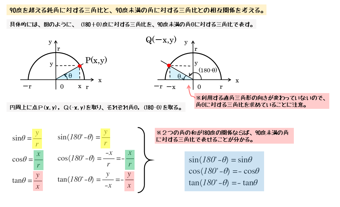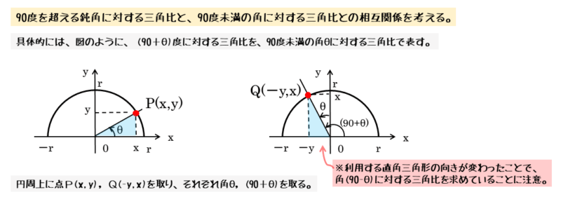 また、鋭角のとき、動径と円周との交点Pの座標を(x,y)とすると、鈍角のとき、動径と円周との交点Qの座標は、合同な直角三角形を上手く利用すると(-x,y)です。