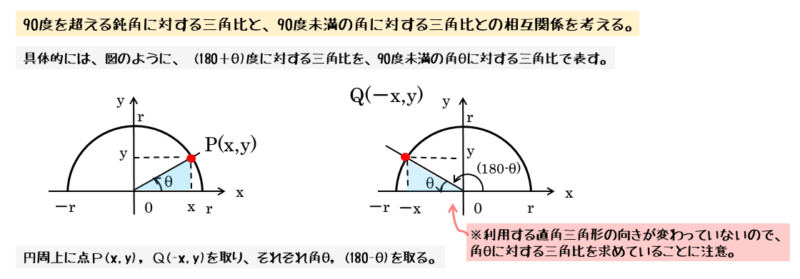 なぜこのようなことが必要かと言うと、三角比の拡張で学習したように、鈍角に対する三角比を求めると言っても、実際には鋭角に対する三角比を利用しているからです。