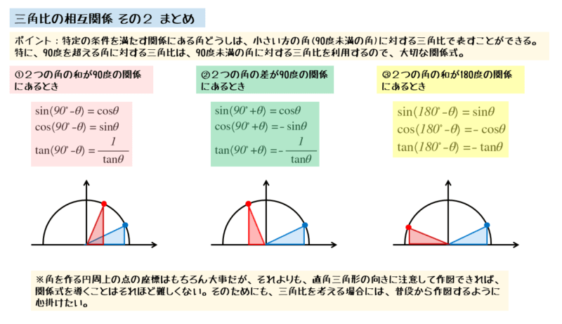 この相互関係から、2つの角の差が90°のとき、90°を超える鈍角を使わず、鋭角に対する三角比を求めれば良いことが分かります。